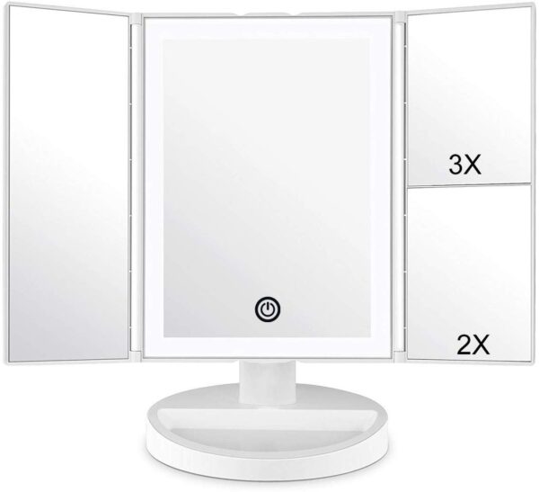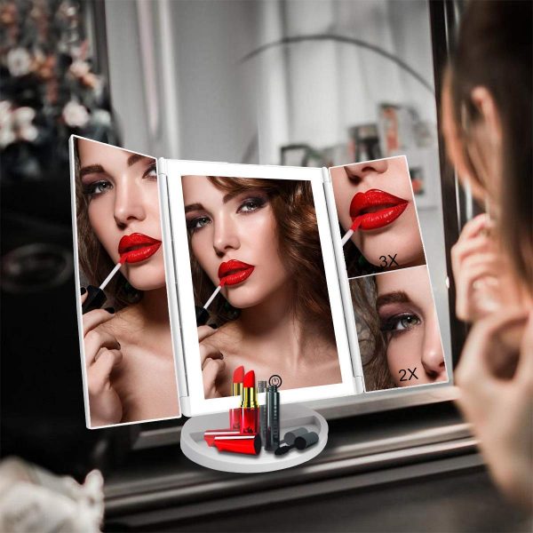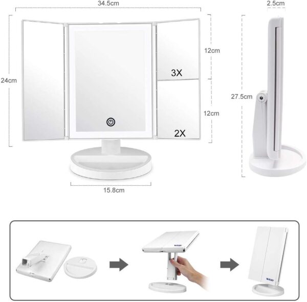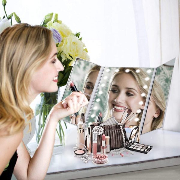 - ROTACIÓN Y TRIFOLD DE 180 GRADOS: el espejo de maquillaje iluminado que se encuentra en la encimera se puede ajustar libremente y se puede fijar un ángulo de visión perfecto y cómodo. El diseño tríptico y desmontable te permite llevarlo a donde sea que vayas.