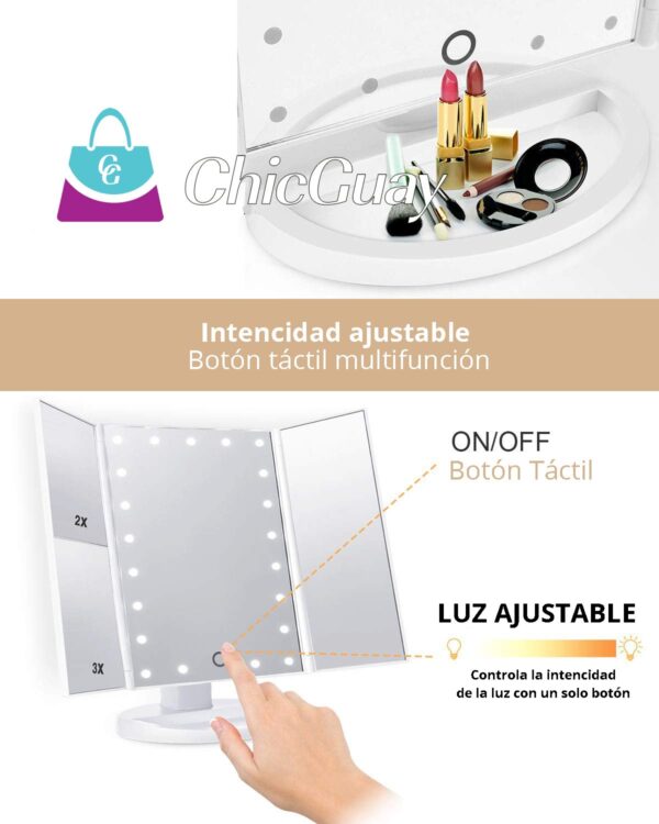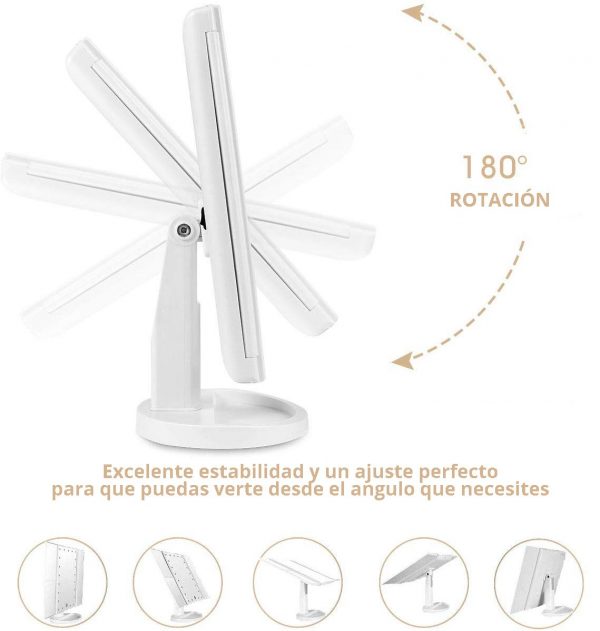 -Un espejo de vanidad LED y TÁCTIL, que le permitirá maquillarse en cualquier lugar a cualquier momento, incluso en el bar, el vehículo u otros lugares de luces oscuras. Le proveerá luces suaves y luminosas y le asegura el estado perfecto del maquillaje.