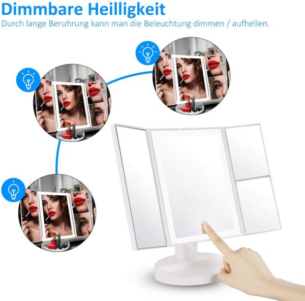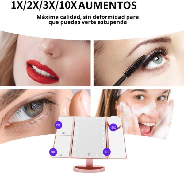Espejo Maquillaje, Luz ajustable con LED Táctil, Tríptica Aumentos 1X, 2X, 3X, 10X, Rotación ajustable de 180 °, fuente de alimentación doble
