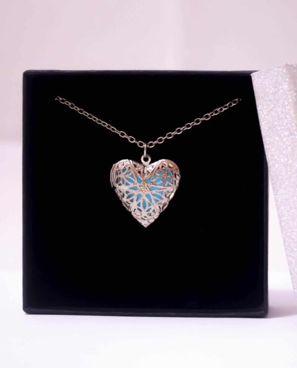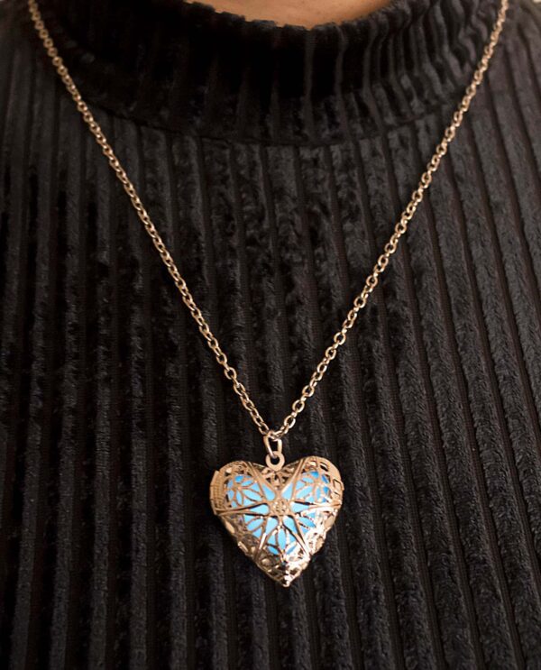 Collar utilizado en colorterapia, está fabricado en aleación de metal, con piedra orgánica Bioluminiscente en forma de corazón que retiene la luz por 2 horas.