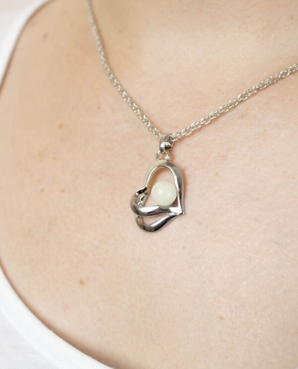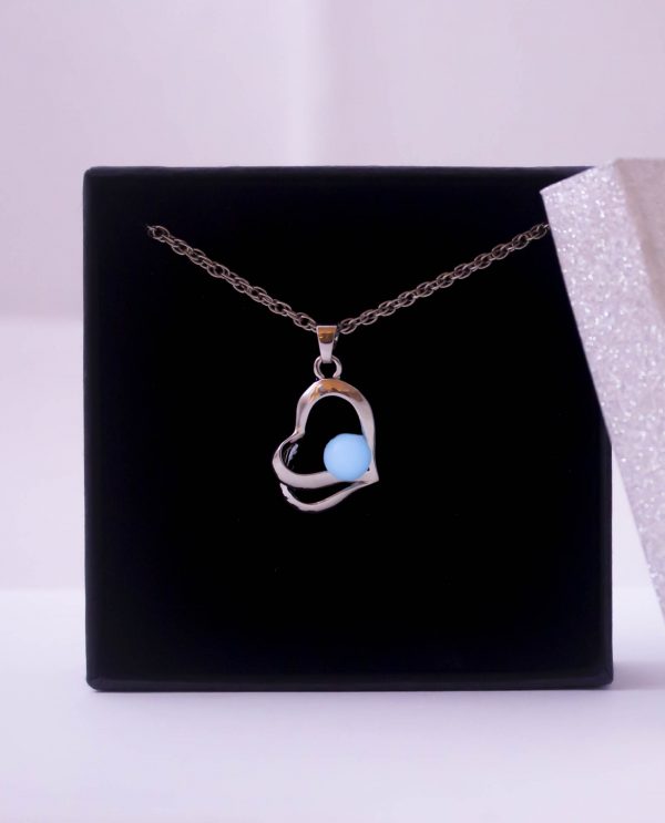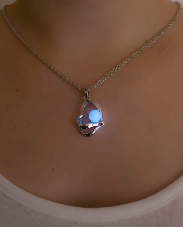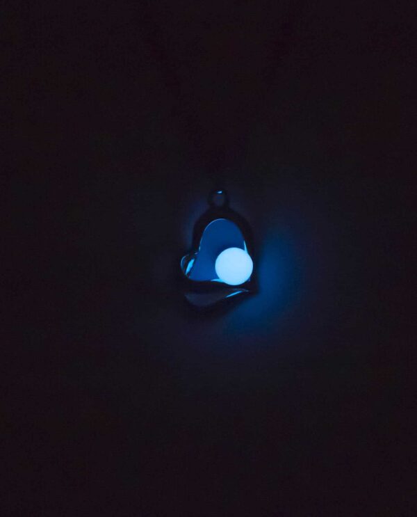 Collar utilizado en Cromoterapia, también conocida como Colorterapia, está fabricado en aleación de metal, con piedra orgánica Bioluminiscente en forma de corazón que retiene la luz por 2 horas.