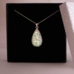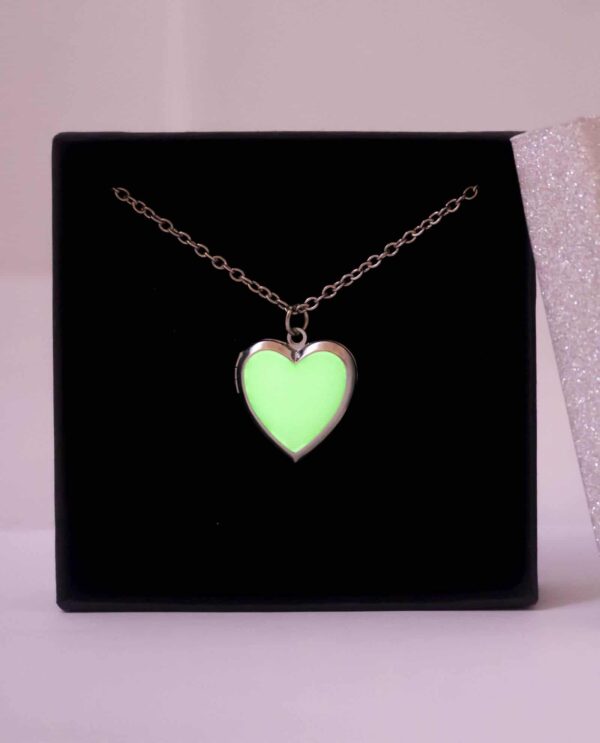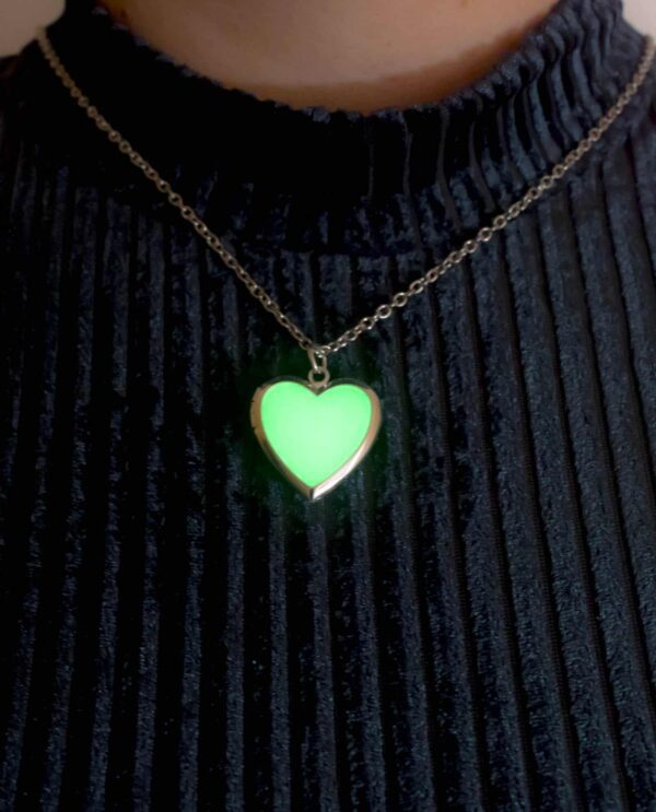 Collar utilizado en Cromoterapia, también conocida como Colorterapia, está fabricado en aleación de metal, con piedra orgánica Bioluminiscente en forma de corazón que retiene la luz por 2 horas.