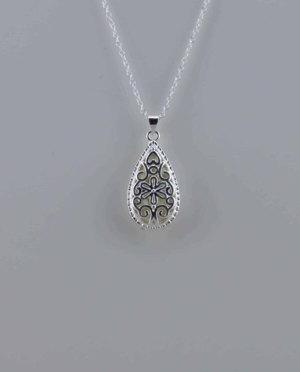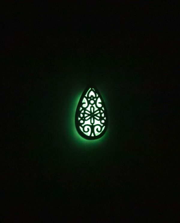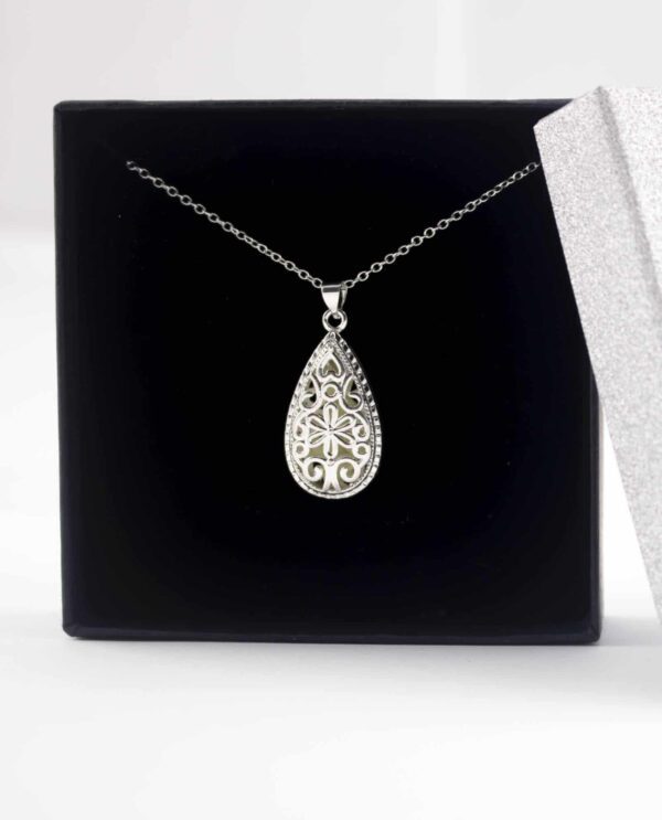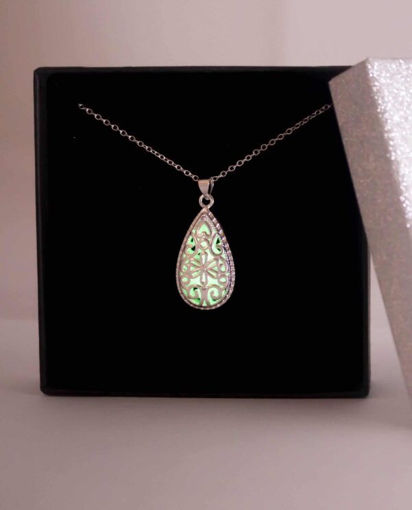 Collar utilizado en Cromoterapia, también conocida como Colorterapia, está fabricado en aleación de metal, con piedra orgánica Bioluminiscente en forma de corazón que retiene la luz por 2 horas.